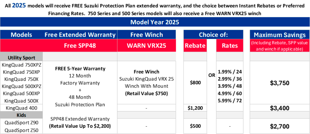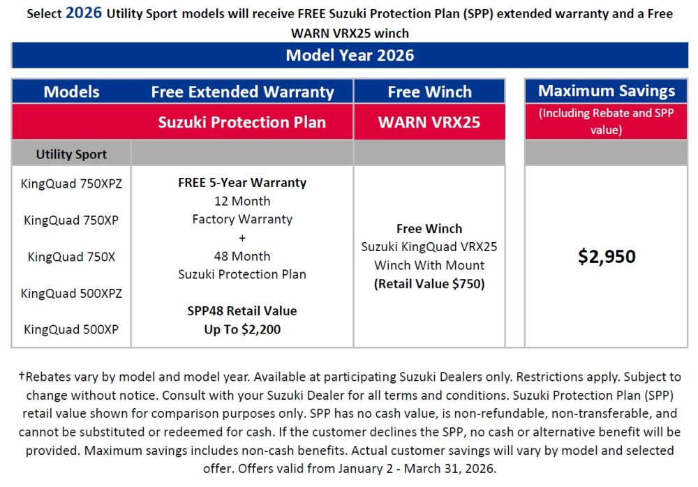 • FREE Warn VRX25 winch with 2025/2026 KingQuad 750 and 500 models.